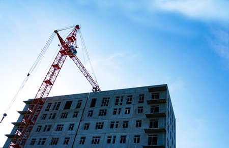 Lifting crane build a house, building site. concept of erecting an apartment building from brick and blocks, panels.