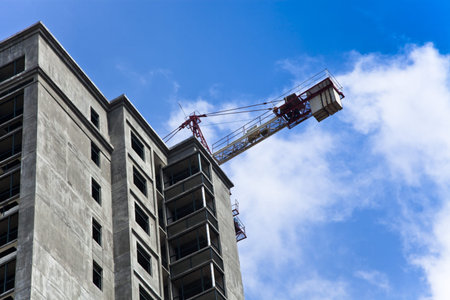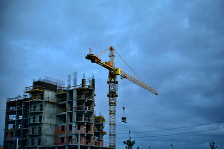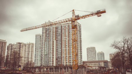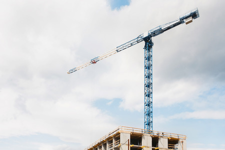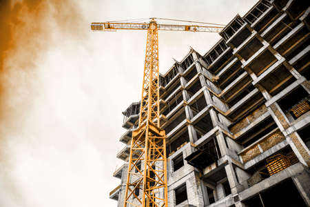 poster construction building crane urban landmark apartment architecture shape exterior foreshortening from below on cloudy sky background view