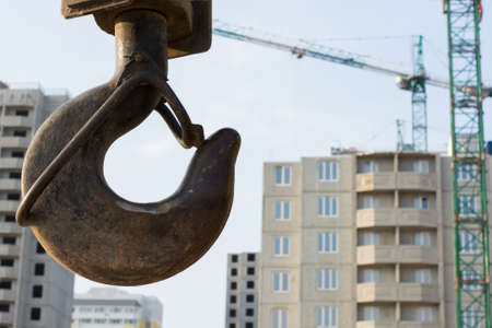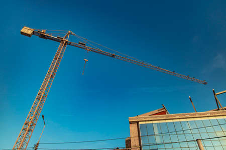 Construction crane against the blue sky. The real estate industry. A crane uses lifting equipment at a construction site.