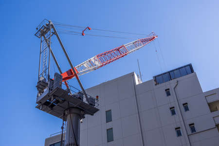 Tel Aviv, Israel - 29 of July 2019: Red and white building crane on the construction of a modern high-rise building at the background of bright blue sky, high-rise building.