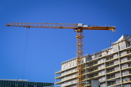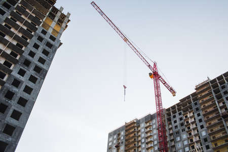 Construction of a modern residential area, apartment buildings. Construction crane on the background of houses on a sunny day.