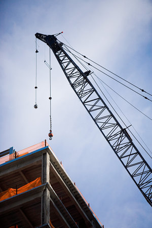 Crane above the new low-rise building under construction on sunny day in British Columbia, Canada
