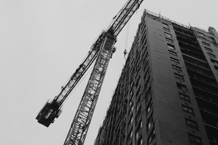 A construction site showcasing a tall building under development, with a prominent crane against a moody grey sky, reflecting urban growth and architectural advancement.