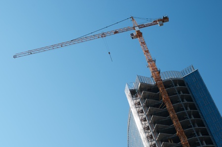 Apartment or office tall building under construction. Brick walls, glass windows, scaffolding and concrete support pillars. Tower crane on bright blue sky copy space background.