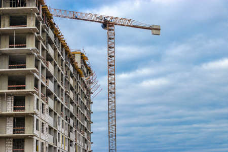 Panorama of a multi-storey residential building under construction and crane on a background of blue sky