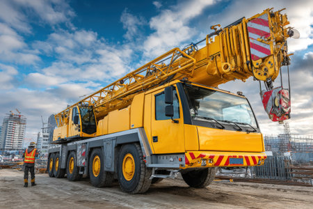 Mobile crane is positioned on truck at construction site, highlighting robust machinery against a backdrop of dramatic clouds, perfect for industrial themes
