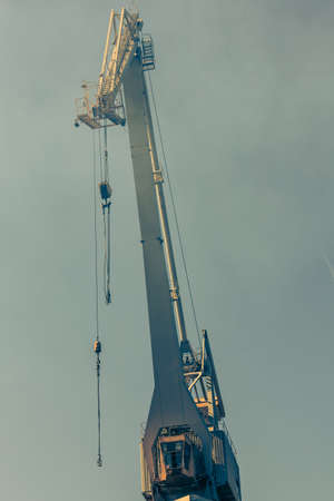 Construction crane and hook with chain on blue sky and sea background