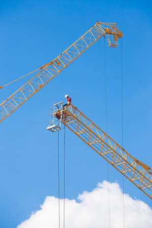 Tower crane installation. Hoist device detail. Work at heights. Working man on steel boom of lifting machine. Blue sky background. Dangerous building work, belaying. Occupational safety. Bottom view.