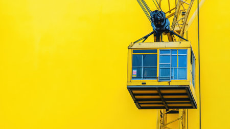 A bright yellow construction crane stands out against a vibrant yellow wall, showcasing urban industrial design. The crane's cabin offers a safe work area above the city.