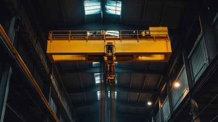 A powerful industrial crane towers over a spacious warehouse, showcasing the intricate design and functionality of modern machinery in a well-lit environment.