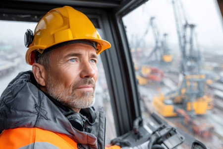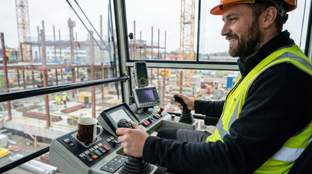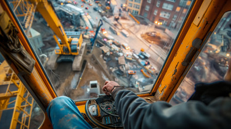 Crane Operator Monitoring Site. Professional crane operator in safety gear observing construction site from elevated position with communication headset.