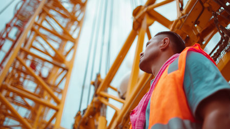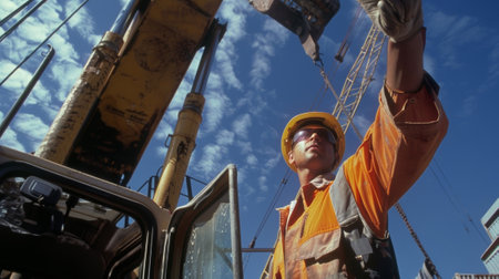 A construction worker confidently directs a crane operator using hand signals to ensure the safe and accurate placement of a load