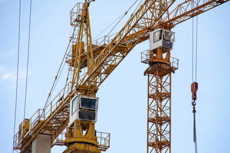 Yellow heavy duty industrial tower construction crane against blue sky with copy space