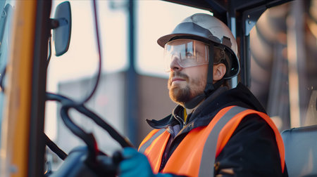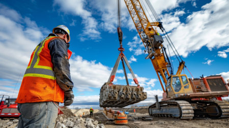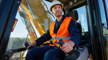 An operator skillfully controls heavy machinery at a construction site. The operator wears a safety vest and helmet while focused on the task at hand in bright daylight