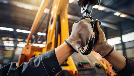 Close-up of the hands of a man driving a construction machine