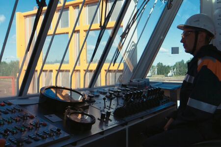 Male worker sitting in operator cabin of overhead crane