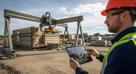 A construction engineer in a hard hat and safety vest uses a digital tablet to control a large-scale 3D printer building a house. The scene represents the convergence of construction, technology, and engineering, highlighting smart and innovative building methods.