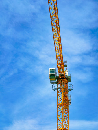 A tower crane operator's cabin with a part of the boom against a blue sky with light clouds.