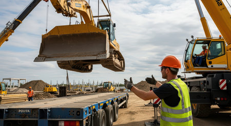 Caucasian male workers operate heavy machinery for construction site loading