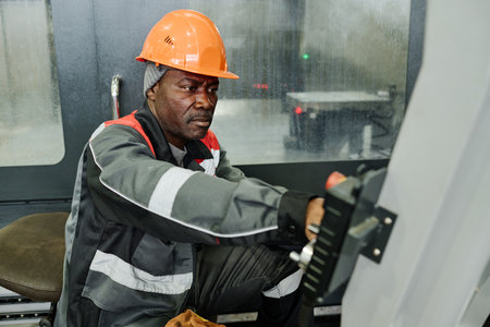 African American worker operating sophisticated industrial machinery in modern workshop. Worker wearing protective gear and focusing on equipment in background