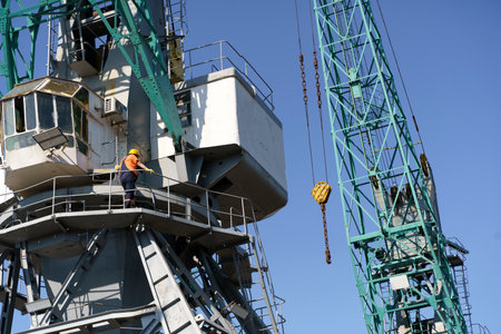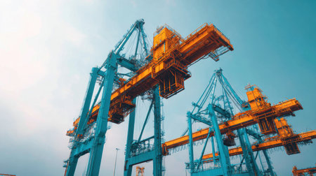 Vibrant industrial scene of shipping cranes in a port, reflecting the critical role of heavy machinery in global logistics and trade operations, set against a bright blue sky.