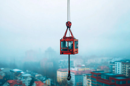 A vibrant red cabin hangs from a crane above a fog-laden city. The surrounding buildings peek through the haze, creating an ethereal atmosphere.