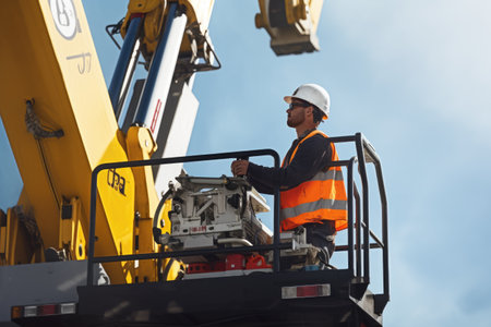 A man wearing a safety vest stands on a lift. This image can be used to depict construction, maintenance, or industrial work.