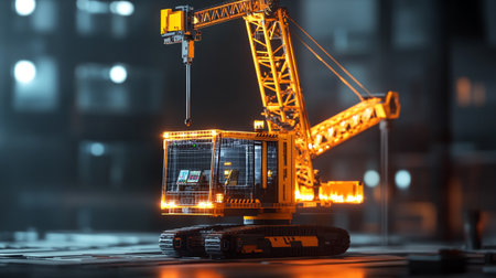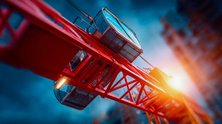 Tower crane at a construction site captured from a low angle with vibrant lighting and modern city backdrop.