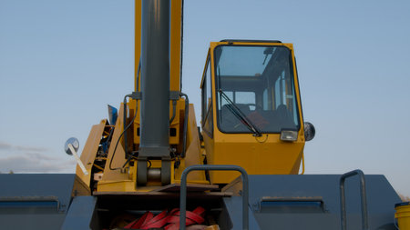 cabin of a big crane close up detail heavy hydraulic construction site powerful equipment hoist machine