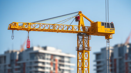 Heavy Construction Crane Reaching Towards a Clear Sky on a Bustling Urban Job Site During Mid Morning. Generative AI