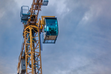 Drivers cab of a crane high in the blue sky, copy space