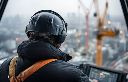 Crane Operator Monitoring Site. Professional crane operator in safety gear observing construction site from elevated position with communication headset.