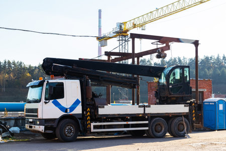Truck crane on construction site. Heavy duty construction equipment. industrial background