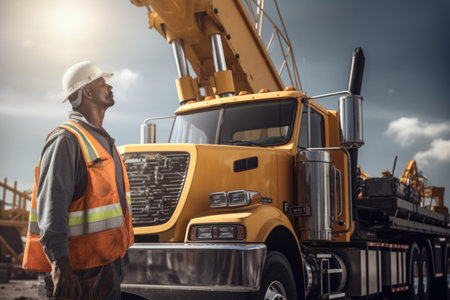 A construction worker standing in front of a large truck. This image can be used to depict construction, transportation, or industry.