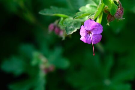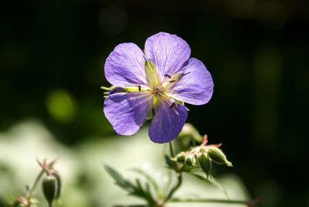Geranium wild flower on a sunny day. Close-up on a blurry green background.