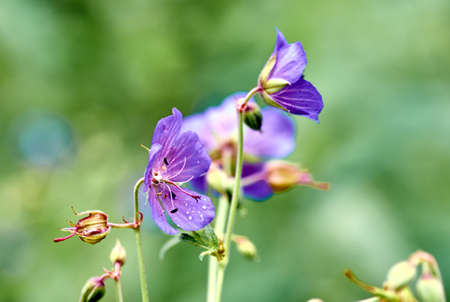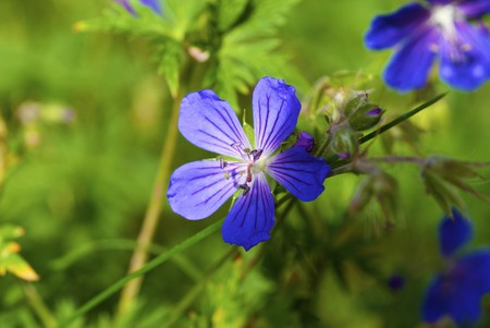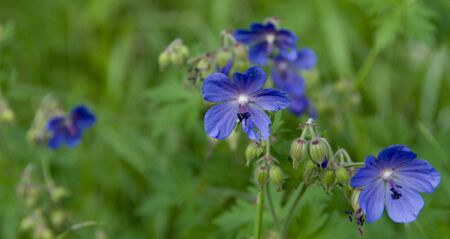 Blue and purple wild geranium flowers on green background