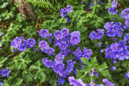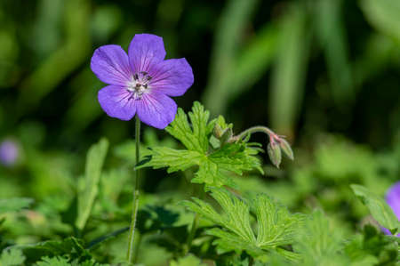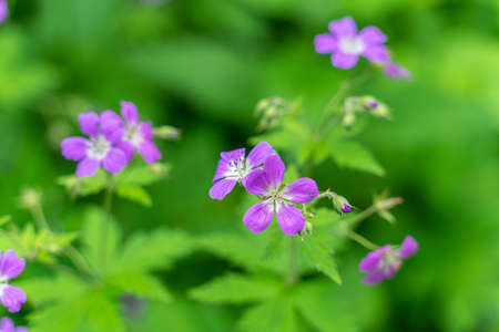 Cranesbills group of flowers, Geranium sylvaticum in bloom, green leaves