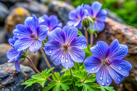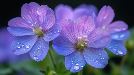 Deep Purple Geranium Blooms with Water Droplets on Petals