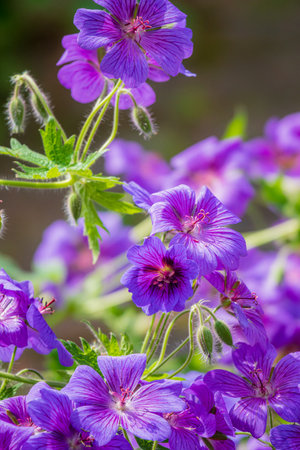 Gorgeous purple bohemian geranium. Lilac geranium flowers in the flowerbed. Beautiful background. Pink and violet flowers, botuns and leaves. Gardening. Flower bed