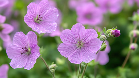 Beautiful pink wildflowers with water drops on petals.