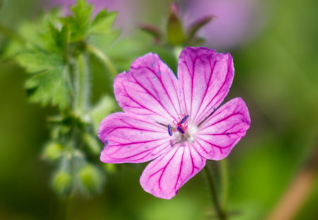 Flower of cranesbill or Geranium with defocused background macro, selective focus, shallow DOF.