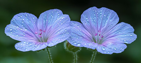 Two Delicate Blue Wildflowers Covered in Dewdrops With Soft Focus Background, Macro Photography