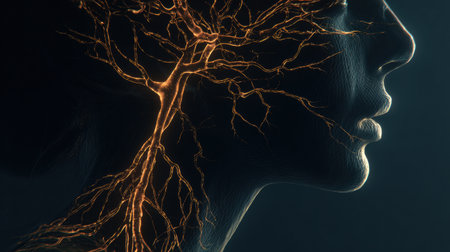 A detailed representation showing the human nervous systems intricate network, highlighting brain connectivity and signals.