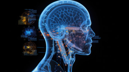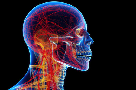 Depiction of human anatomy highlighting cranial and vascular systems with intricate detail and vibrant colors against a dark background