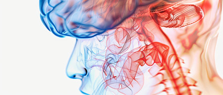This medical illustration depicts a transparent human head, showcasing the brain and nervous system. The image features a detailed representation with red and white lines, indicating veins and nerves. The composition suggests a study of human anatomy, ideal for educational materials or medical presentations. This visual could be used in various commercial applications.