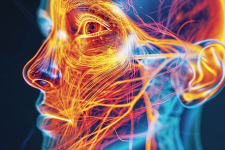 A vivid illustration features a profile of a face with glowing neural connections, showcasing emotions and digital artistry in a dark background.
