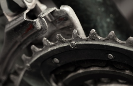 Detail of bicycle components. Closeup of crankset, front derailleur and chains
