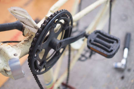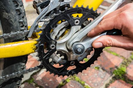 Mountain bike used and dirty front crank drive and link chain close up shot outside.
