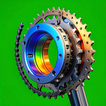 A detailed macro view of a high-performance bicycle drivetrain, showcasing the intricate engineering and vibrant, iridescent finish of the gears.