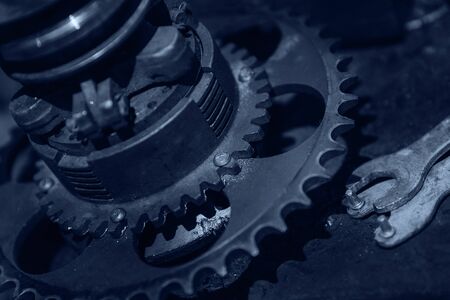 Detail of machine with gears is assembled film crew. Toned photo blue